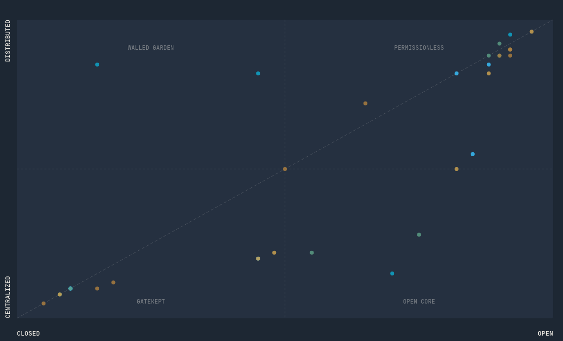 The container didn't improve the ports. It changed what moved through them, and the ports had to be rebuilt from scratch. That rebuild is starting now. To get a sense of what it looks like, I scored a few dozen companies and protocols on how open and how distributed they are across all five layers, an infrastructure map.
