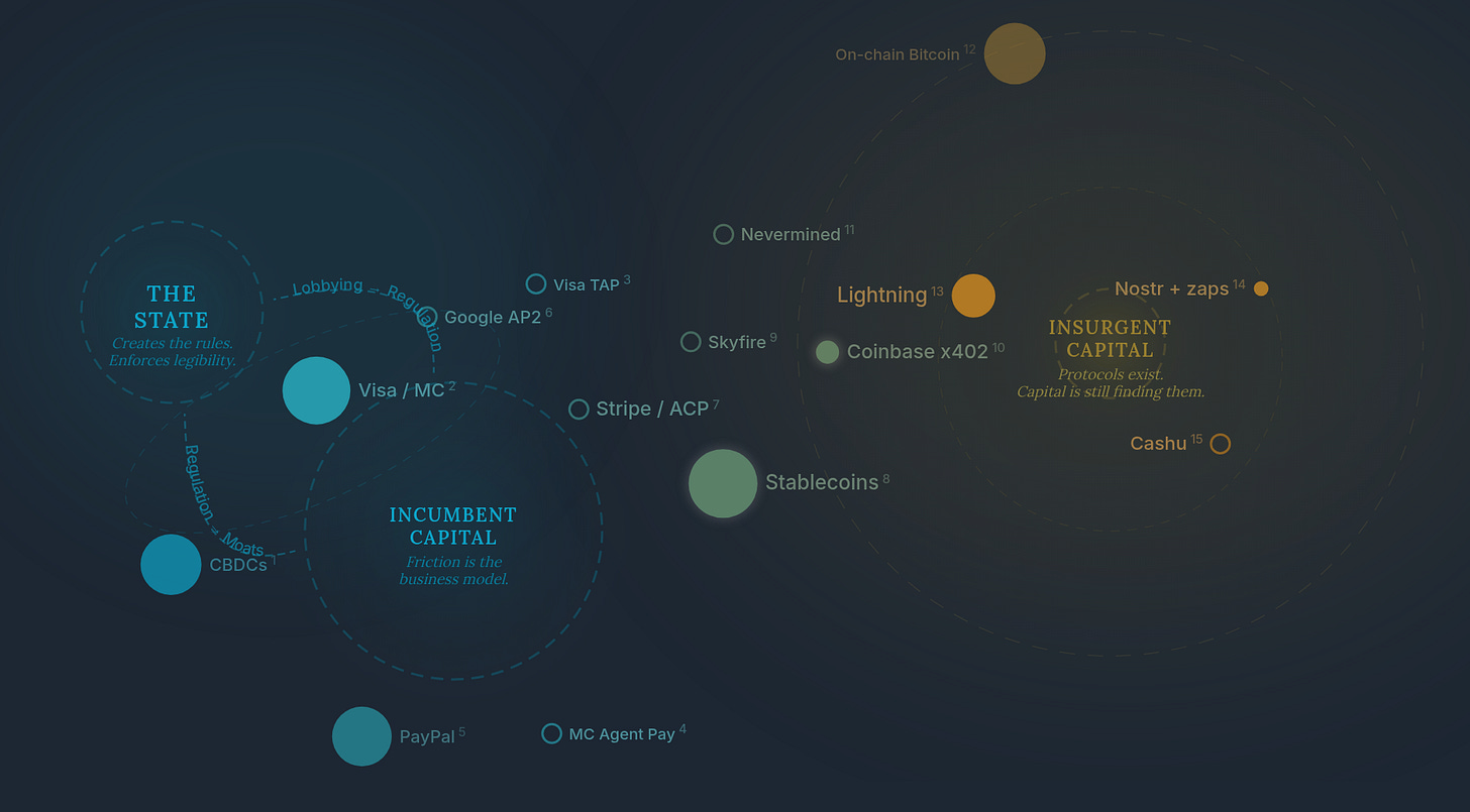 How AI agents will pay for things gets framed as a technology problem, but the technology already exists across the full spectrum from Visa to Cashu. The unanswered question is political. There are three gravitational forces acting on every payment method an agent could use: the state, incumbent capital, and insurgent capital. Two of them are allied, and the third is growing faster than either of them expected.