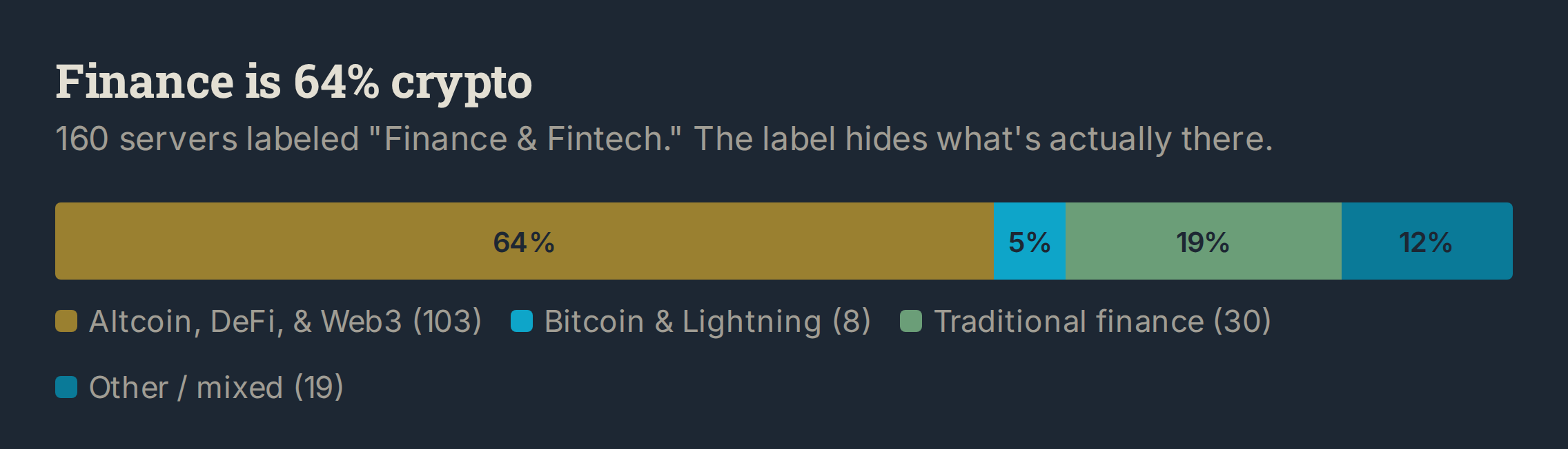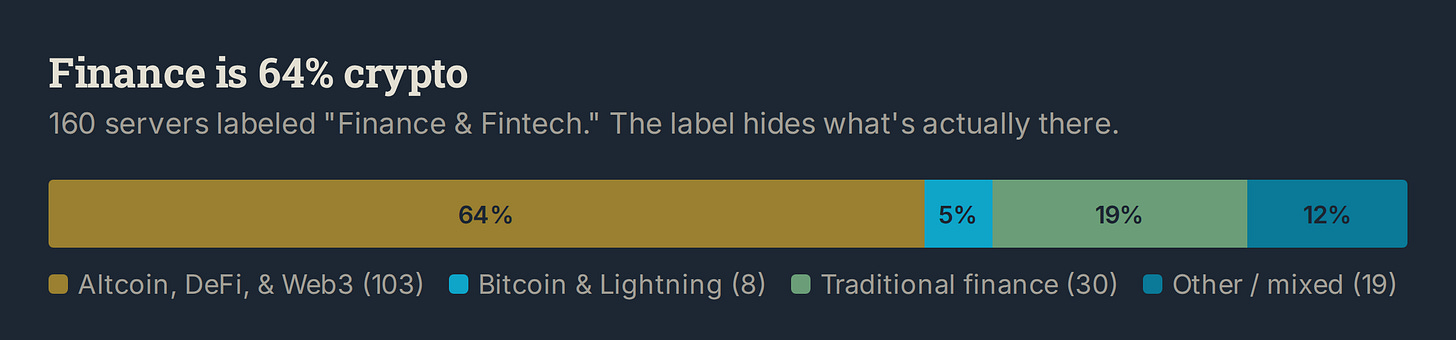 The second-largest category in the ecosystem isn’t fintech infrastructure. It’s crypto developers building for themselves. Of 160 finance servers, 103 are altcoin, DeFi, and Web3. Trading bots, DEX integrations, rug pull detectors, prediction markets. Bitcoin and Lightning account for 8, and those look fundamentally different: Alby wallets, LNbits, L402 agent payment rails. Protocol-level infrastructure, not token speculation. Traditional finance (stocks, banking, accounting) is 30 servers. The “fintech” label is doing a lot of work.