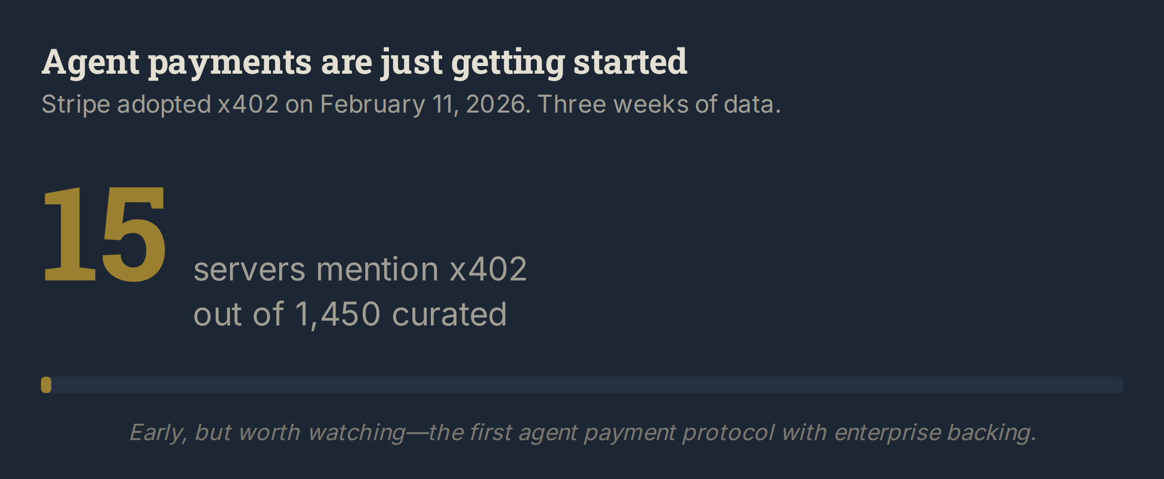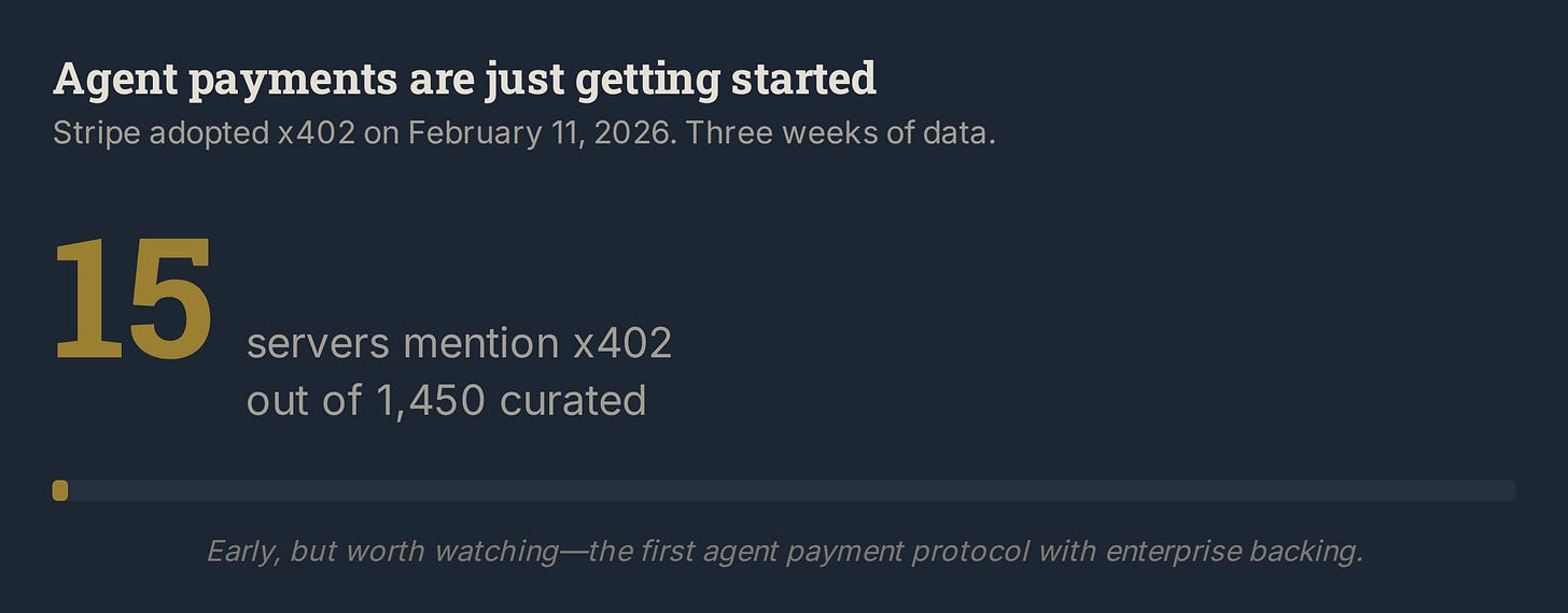 Fifteen servers three weeks after Stripe’s adoption. Too early to read as a verdict. x402 is a month old in its current form. What the number tells you is where the ecosystem is right now: agent payments are a greenfield, not a market. Coinbase launched x402 in May 2025, but Stripe’s entry in February 2026 is what gives it enterprise credibility. The next count will be the interesting one.
