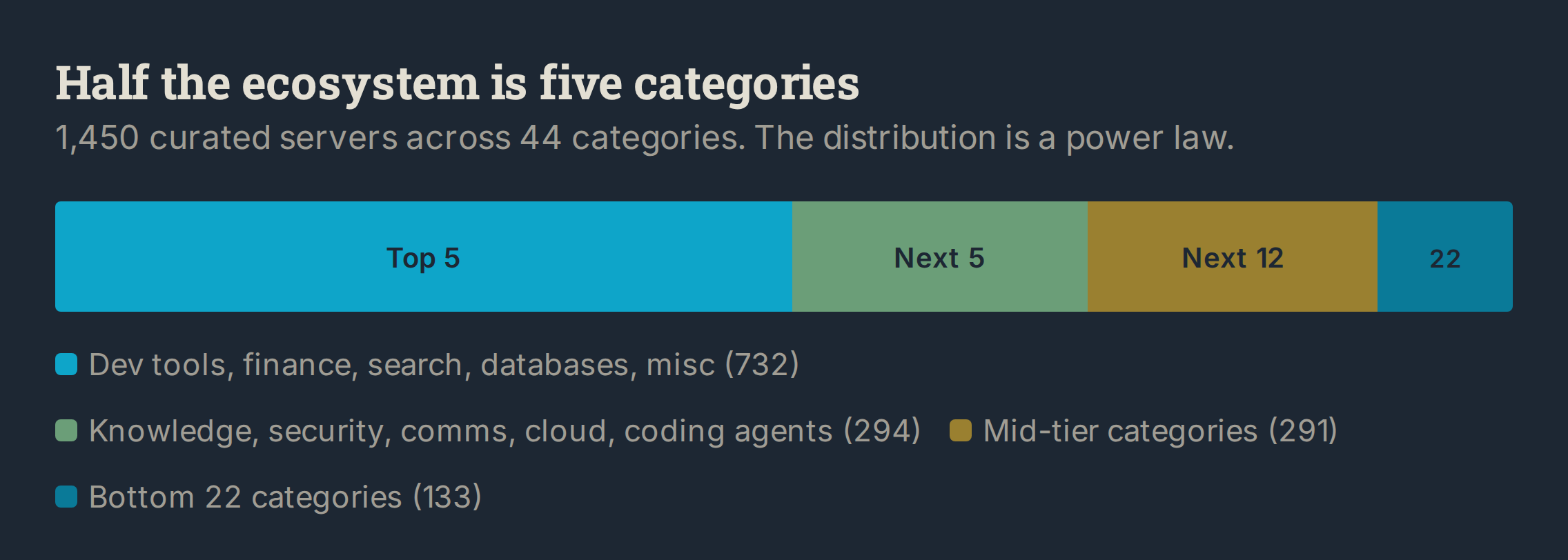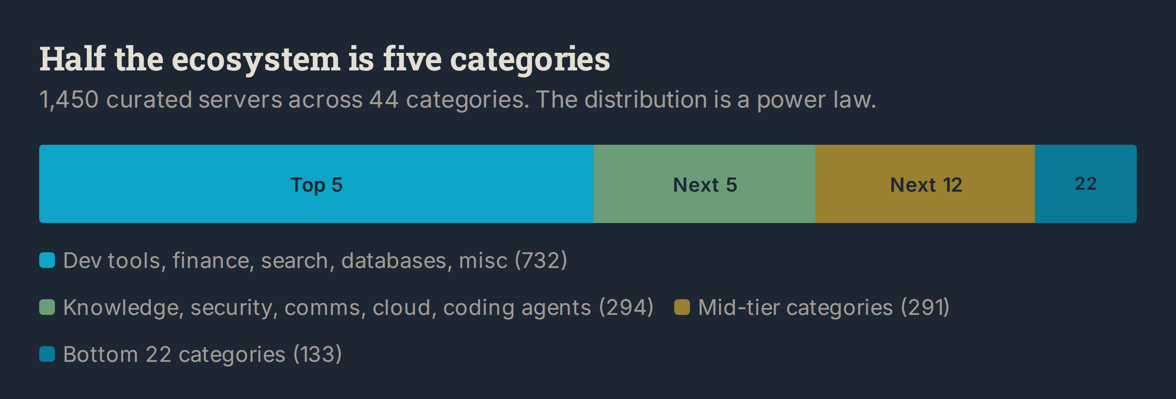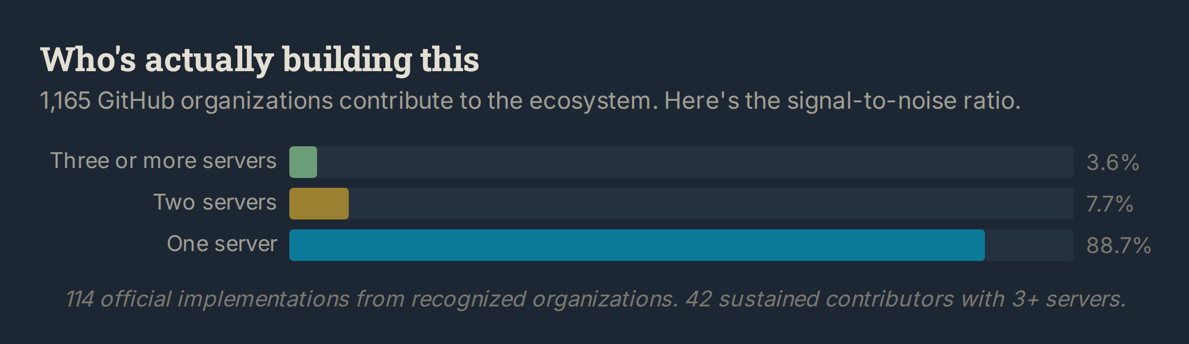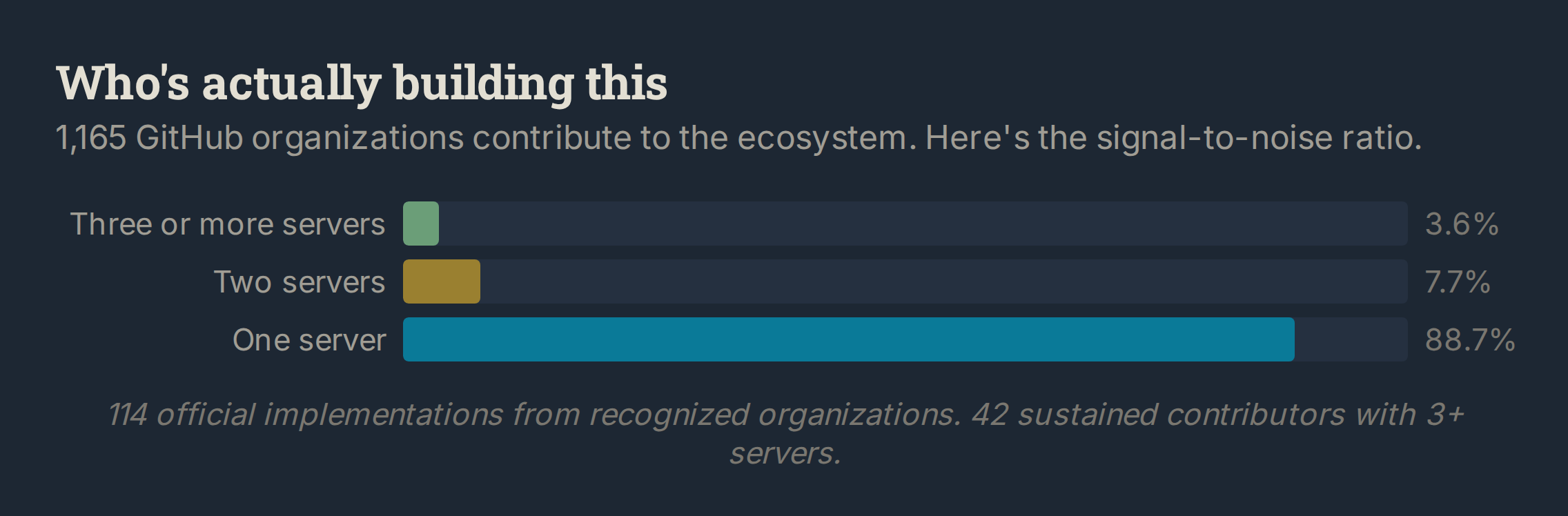 Of 1,165 contributing organizations, 114 are official implementations from companies like Anthropic, Cloudflare, AWS, Hashicorp, Redis, and Pulumi. Another 42 orgs have shipped three or more servers. Sustained investment, not a weekend experiment. Together, these groups account for about 23% of the curated ecosystem. The remaining 77% comes from organizations that contributed once or twice. Normal for open-source adoption curves. It also means the long-term maintenance burden falls on a small core.