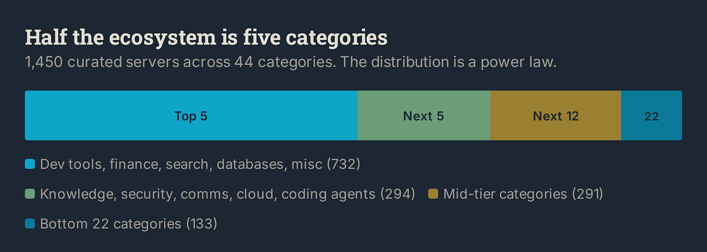 MCP adoption is real. Twenty thousand connectors in fourteen months, backed by Anthropic, AWS, Cloudflare, Hashicorp. But the ecosystem is shaped by what developers need today, not what agents will need to operate on their own. Developer tools, databases, and search are the core. Payments, identity, and discovery are either empty or three weeks old.