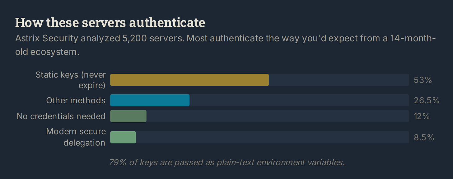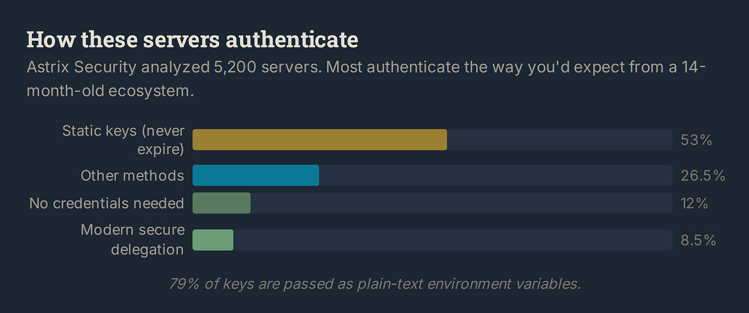 More than half of all servers that need credentials use static keys. Tokens that never expire, can’t be scoped to a specific task, and sit in plain text on developer machines. The modern secure alternative represents 8.5% of the ecosystem. Meanwhile, enterprises report that non-human identities outnumber human ones 82 to 1[4].