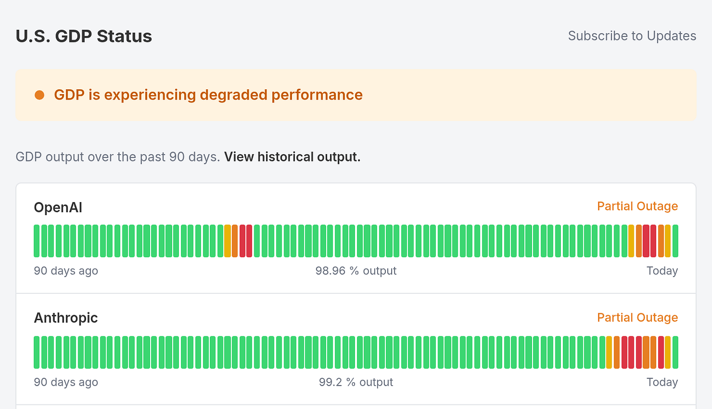 U.S. GDP Status tracks six LLM providers as economic components. 90-day uptime bars. Incident reports with estimated dollar impact. Modeled on the status pages every cloud provider already publishes, because that’s what these companies have become. The data is illustrative, not live. The format is performance art. The premise isn’t.